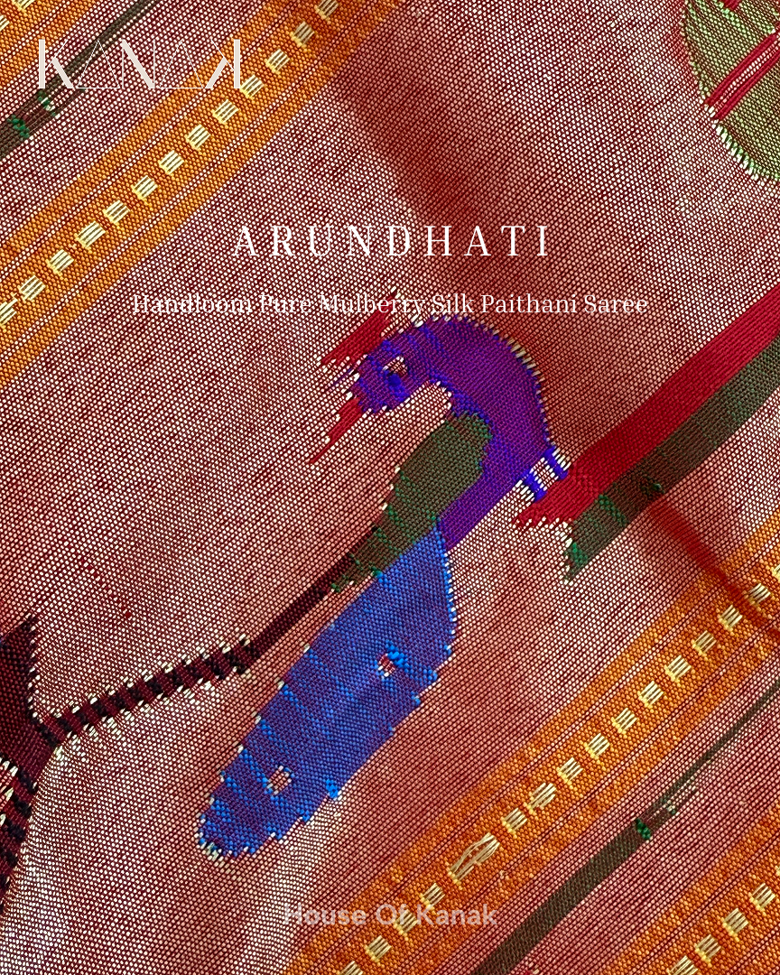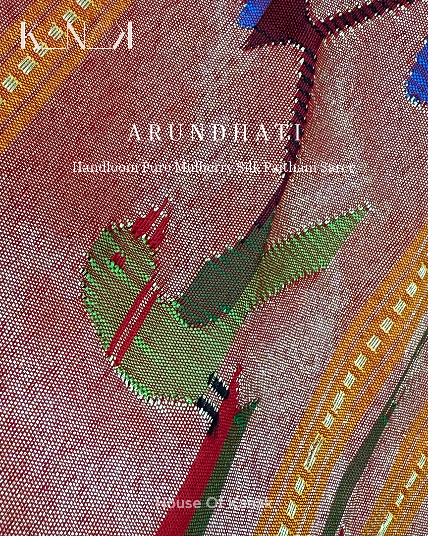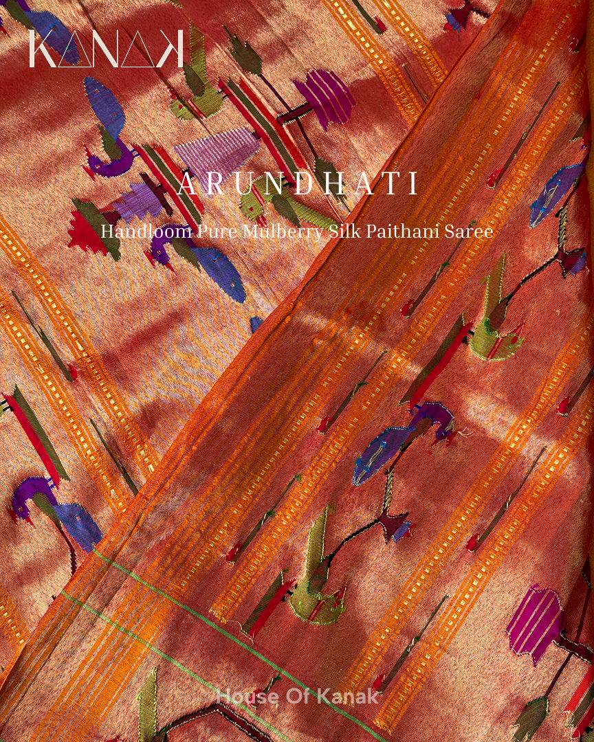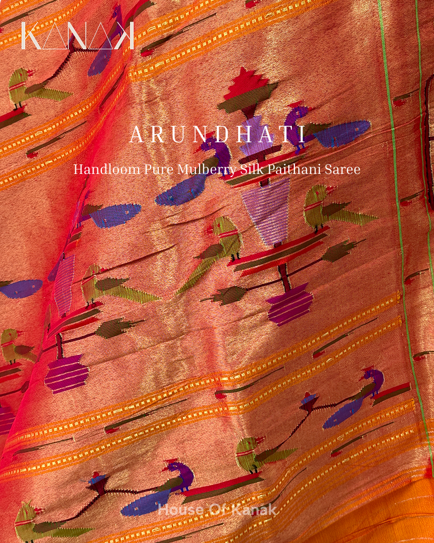 where every thread is spun with devotion, unfolds this masterpiece — a mango-hued Mulberry Silk Paithani.