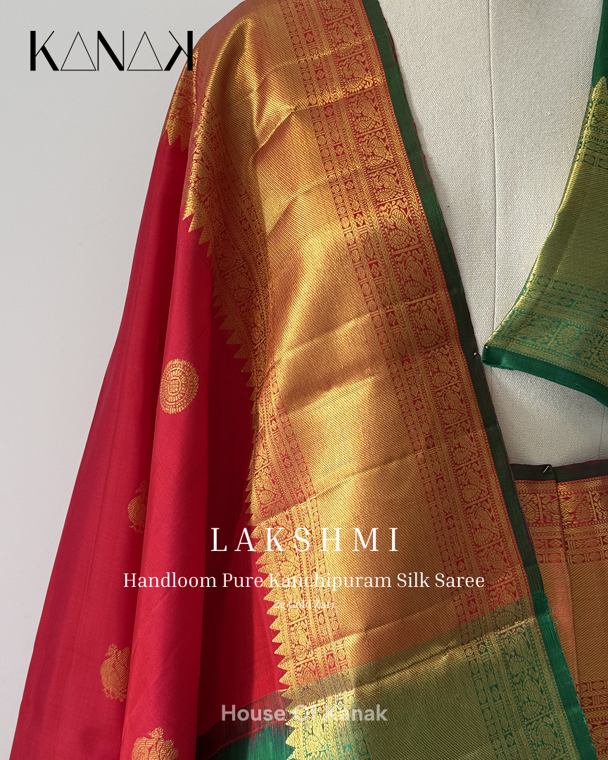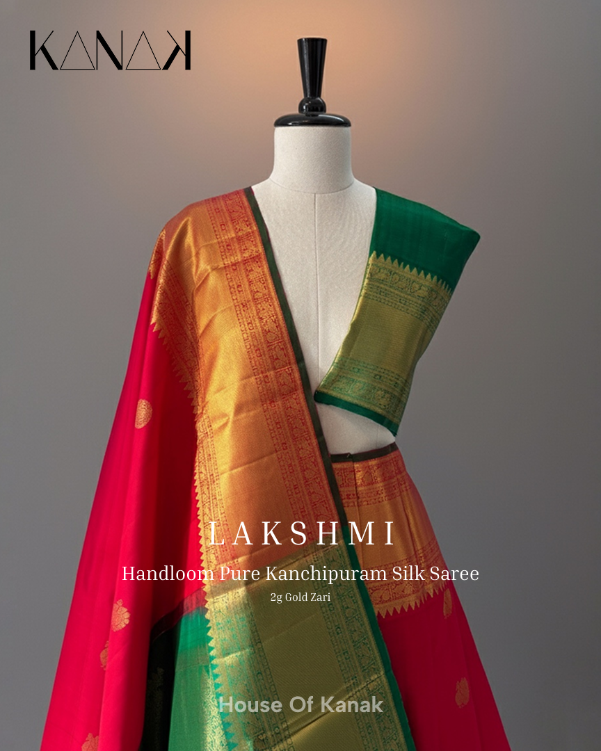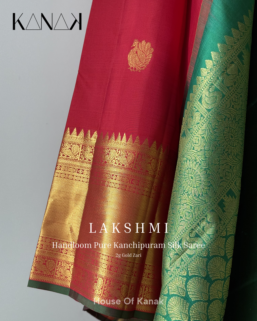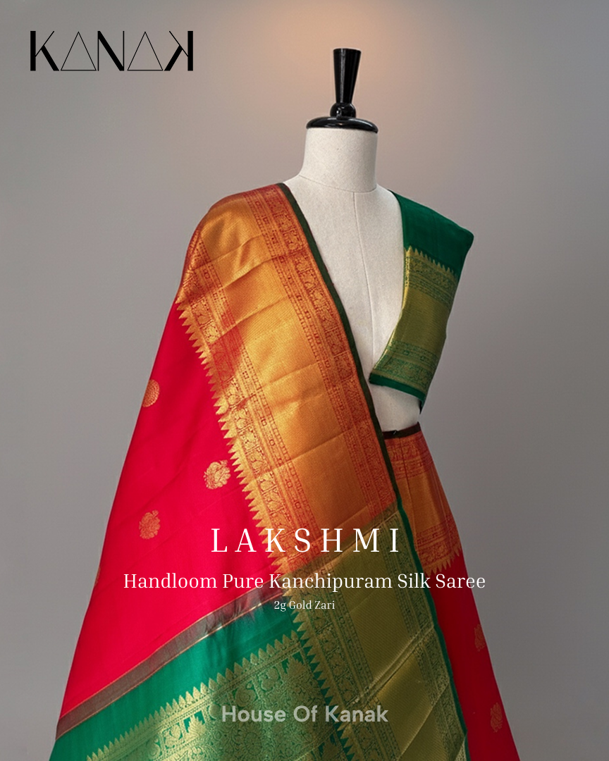 On this sacred day of Lakshmi Pujan, we present Lakshmi — a Handloom Pure Kanchipuram Silk Saree woven with golden zari.