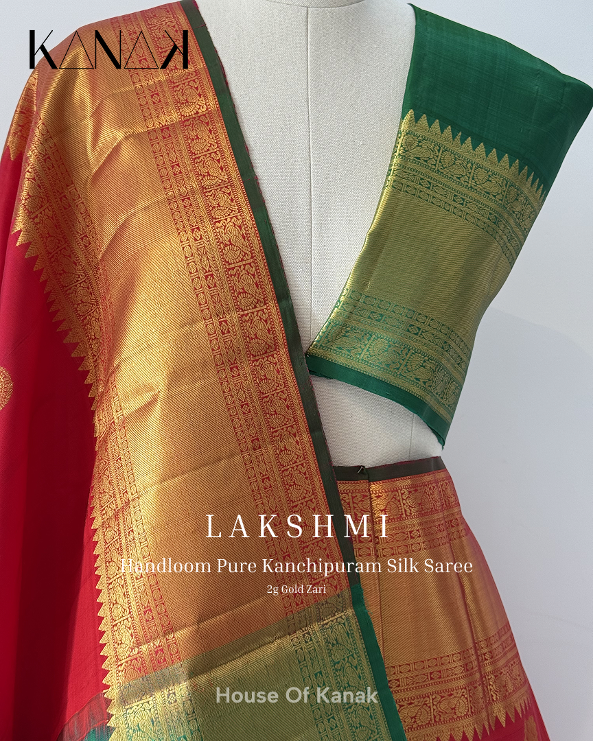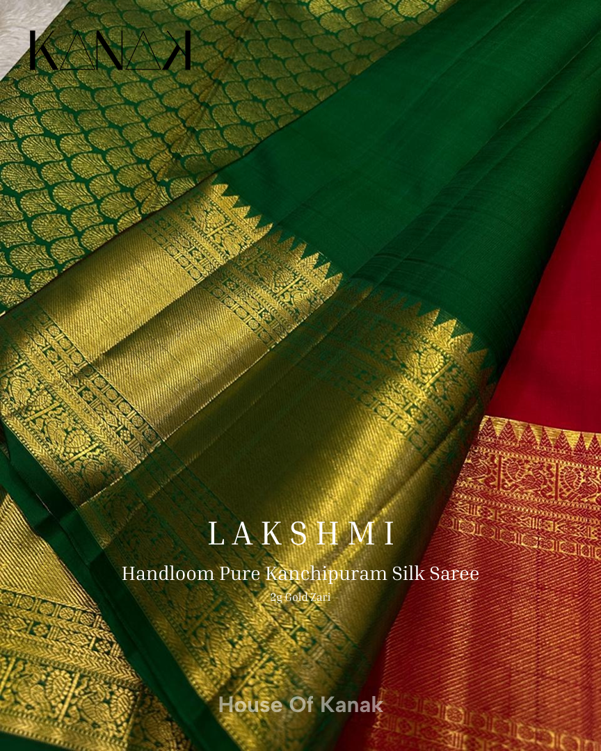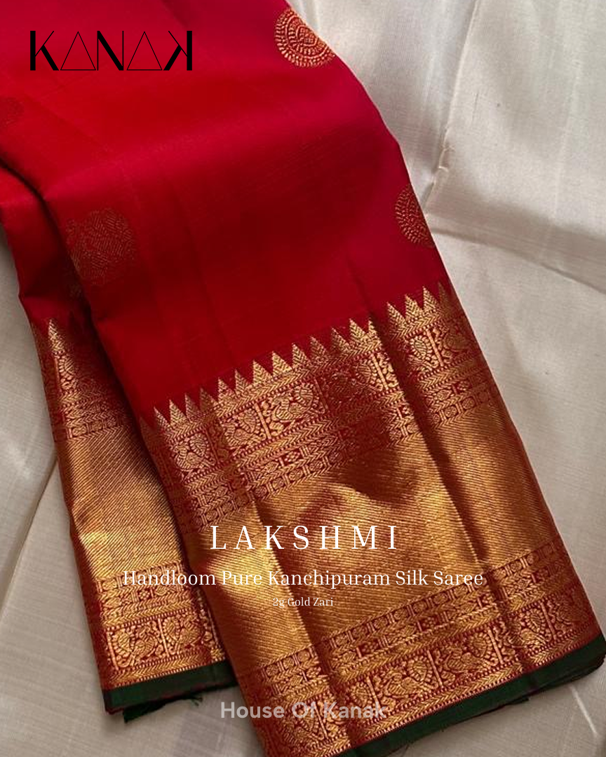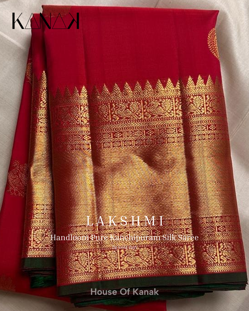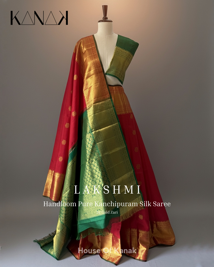 On this sacred day of Lakshmi Pujan, we present Lakshmi — a Handloom Pure Kanchipuram Silk Saree woven with golden zari.