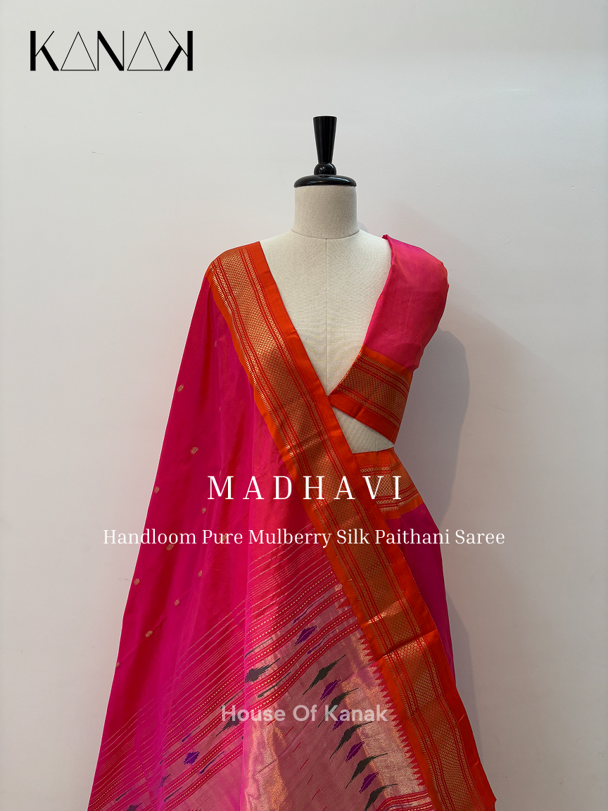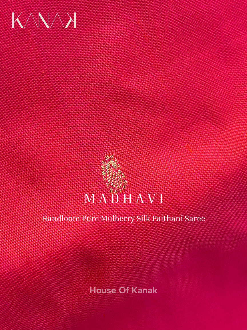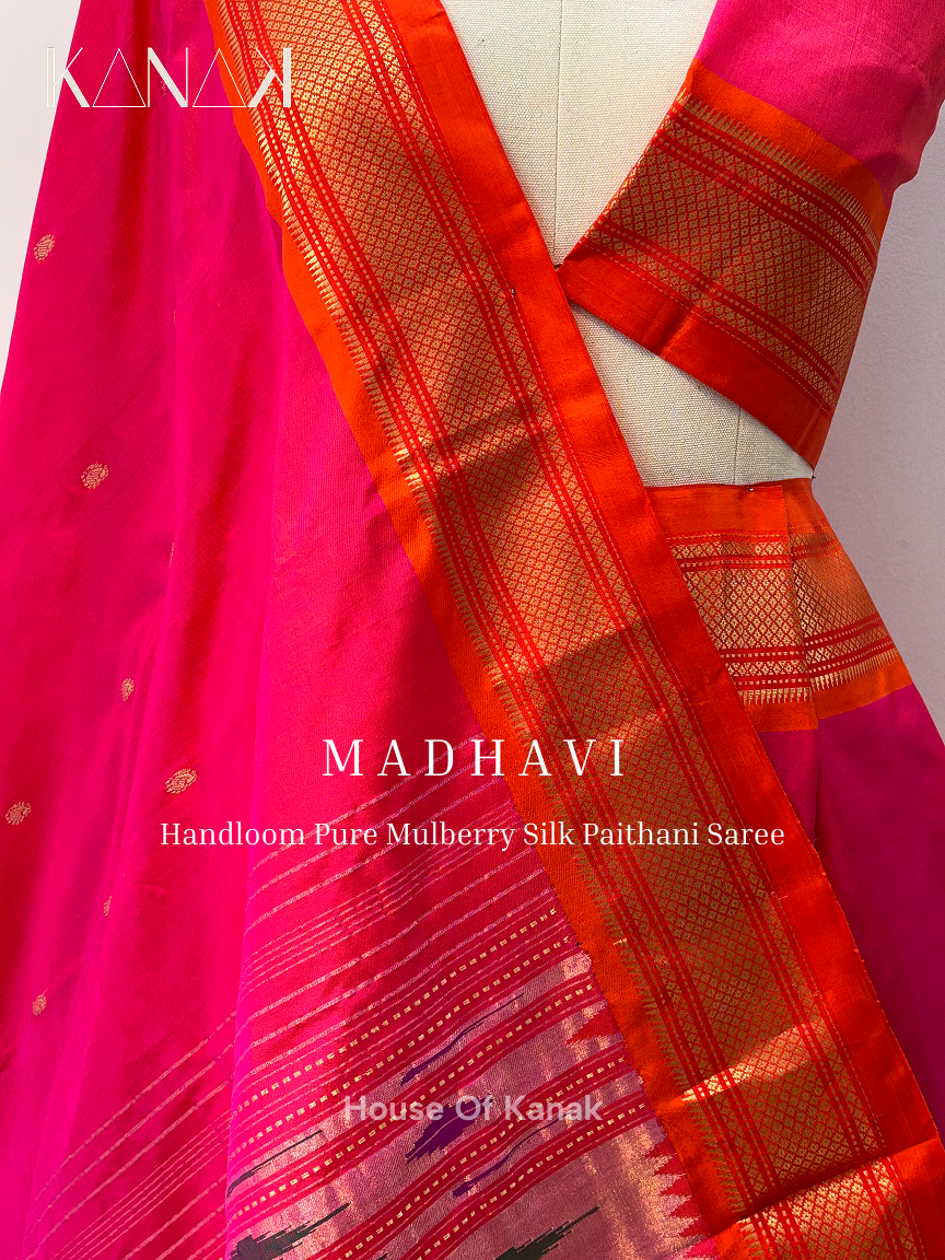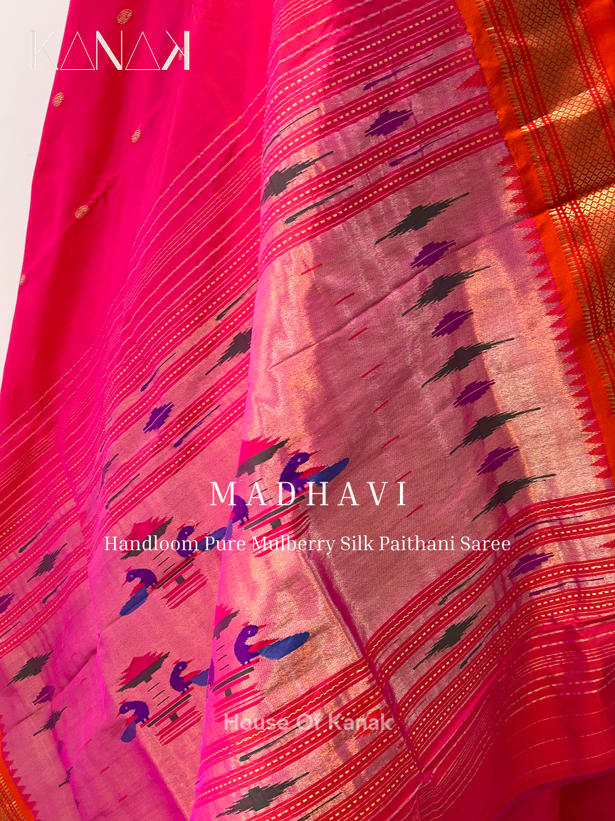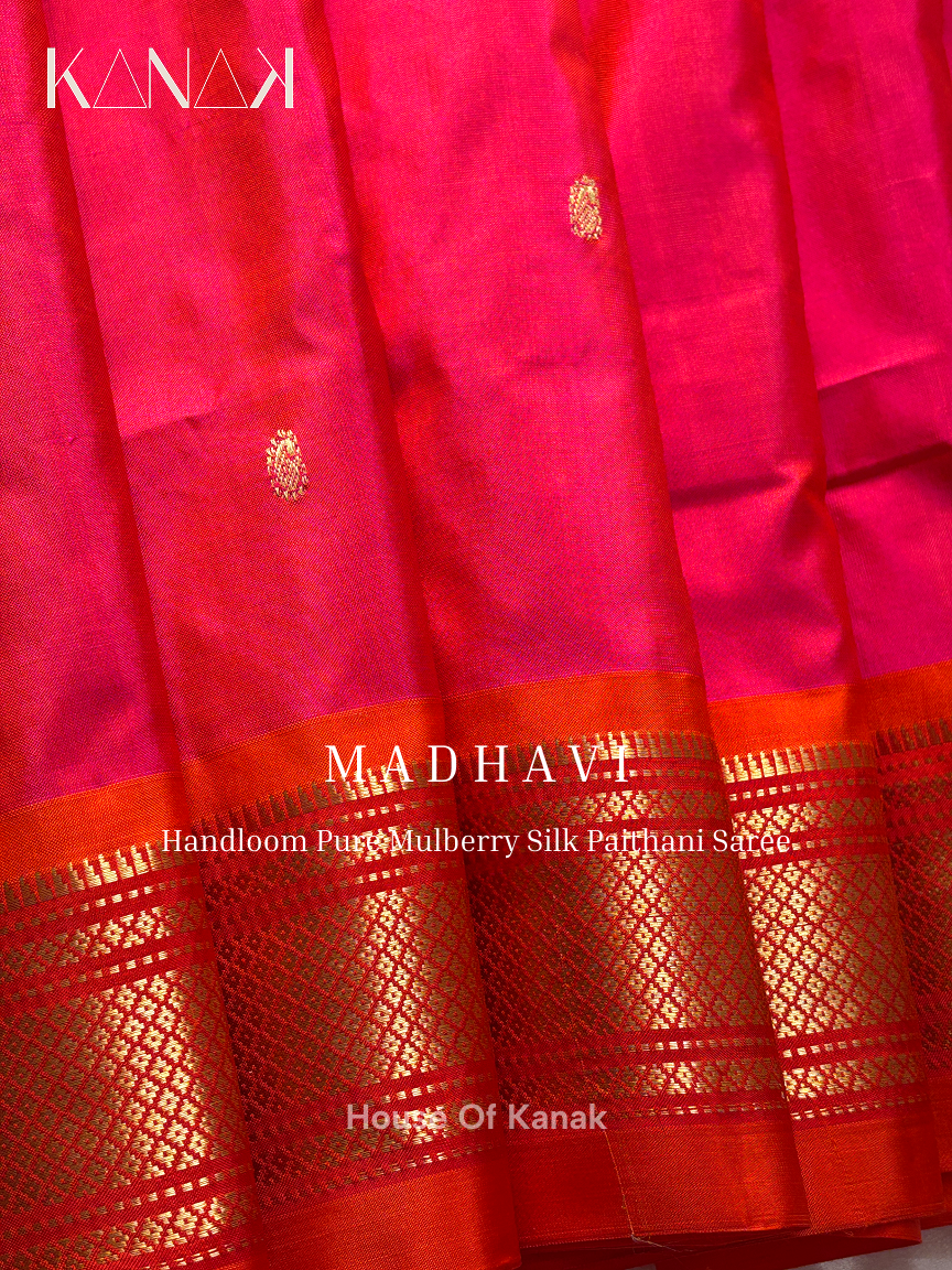 Handloom Mulberry Silk – Bright Pink – Orange Dual Shade Paithani Saree