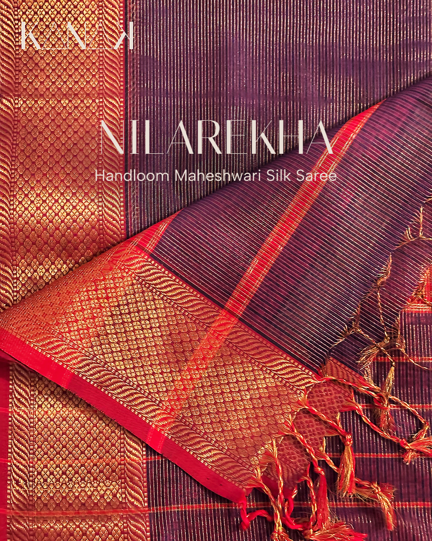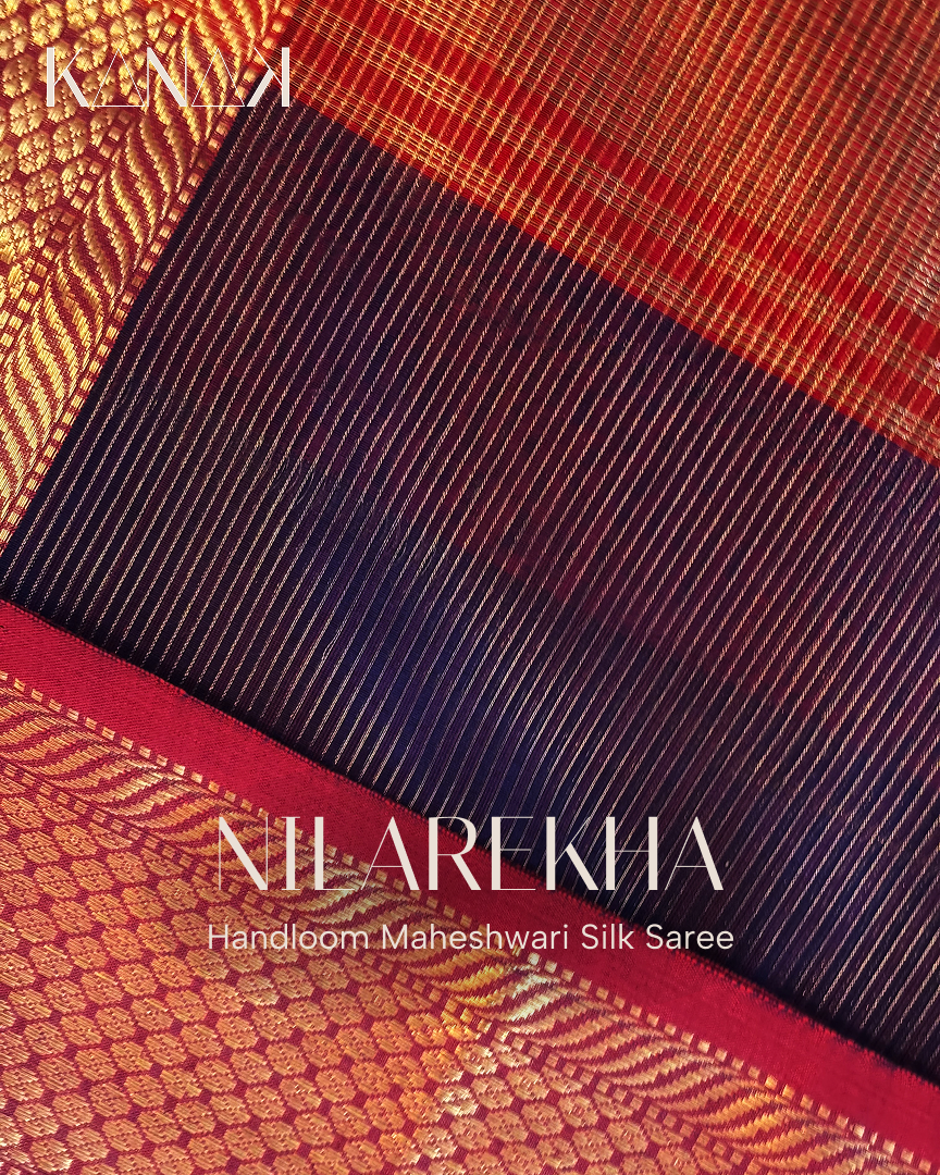 Woven in the heart of Maheshwar, Nilarekha carries the wisdom of riverbanks, temple bells, and the ancestral hands that have kept this art alive for centuries. It is a saree for the woman who doesn’t seek attention — she commands it, gently. She is tradition reimagined, heritage in motion.