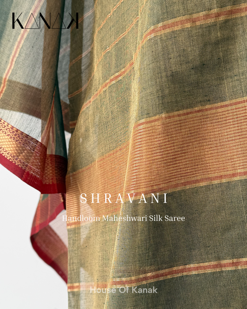 Woven by skilled artisans of Maheshwar, this handloom Maheshwari silk saree carries forward a legacy that has lived through generations.