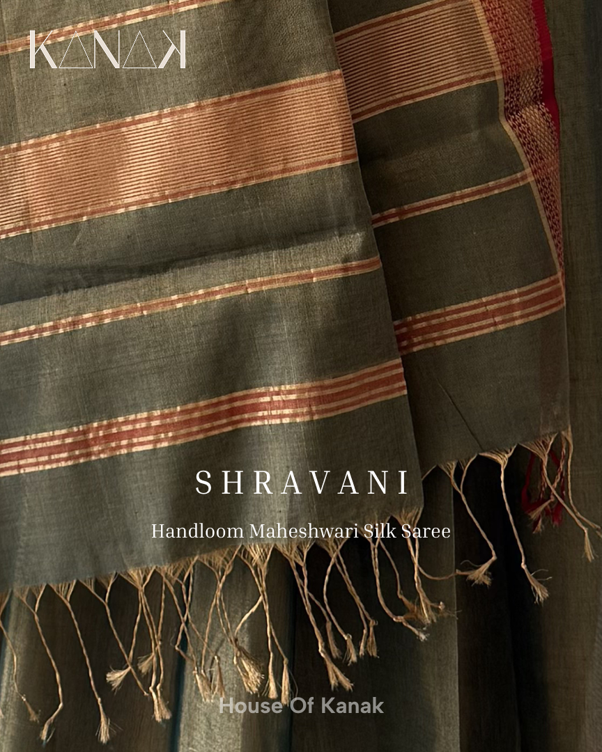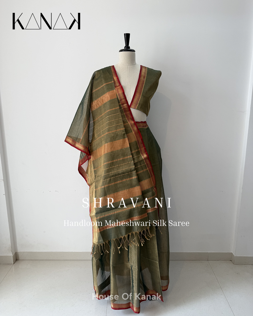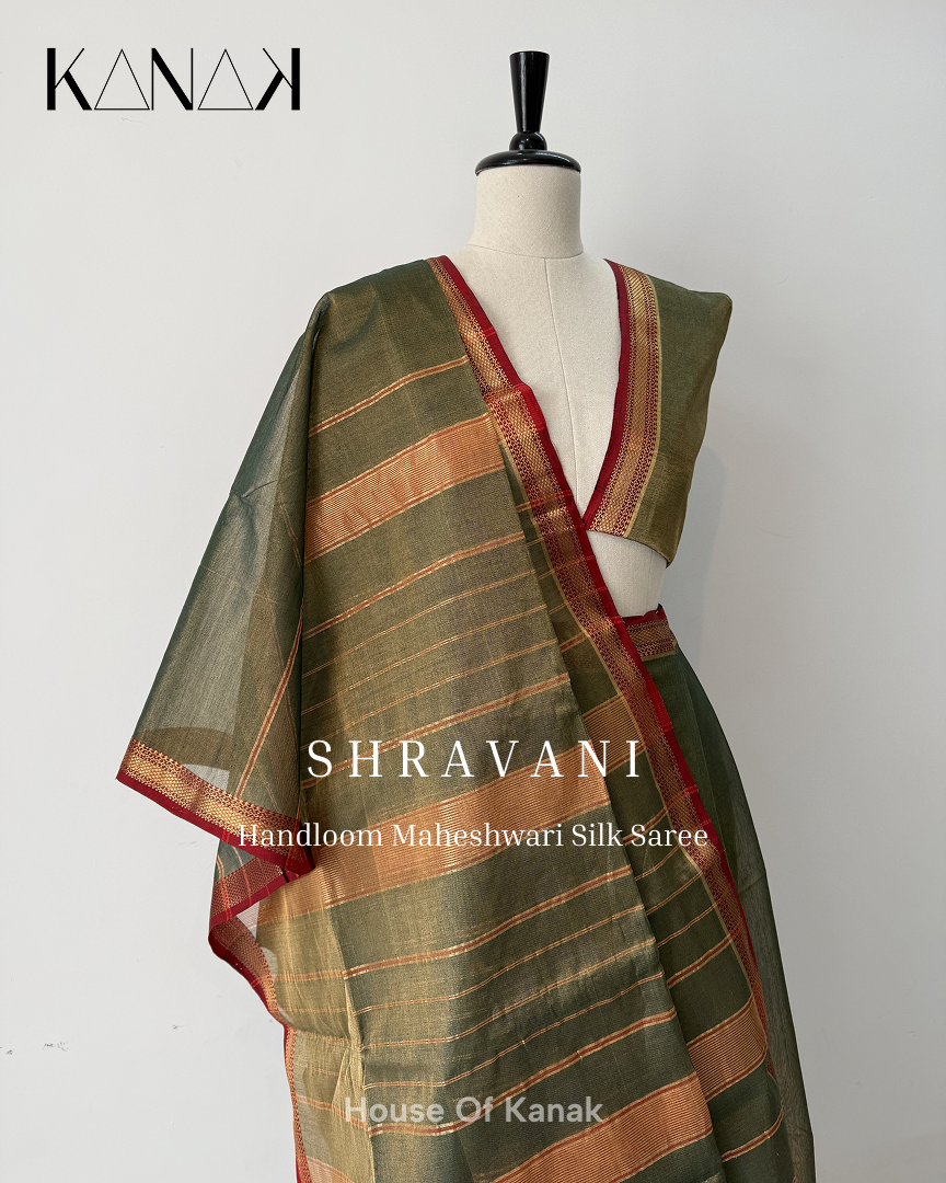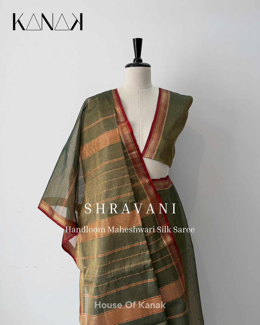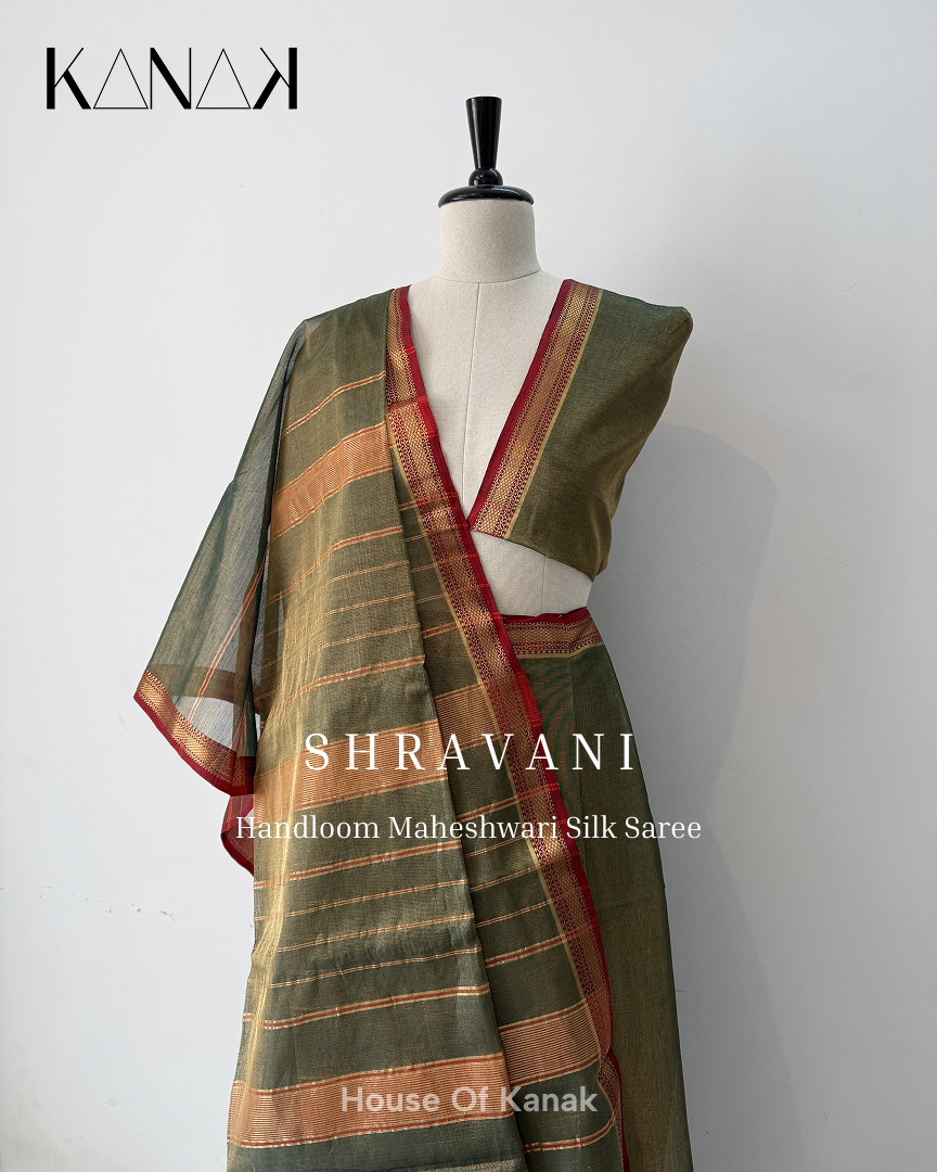 The rich earthy green body, highlighted with subtle golden tissue zari, reflects understated luxury, while the deep red border adds a striking contrast β a perfect balance of strength and grace.