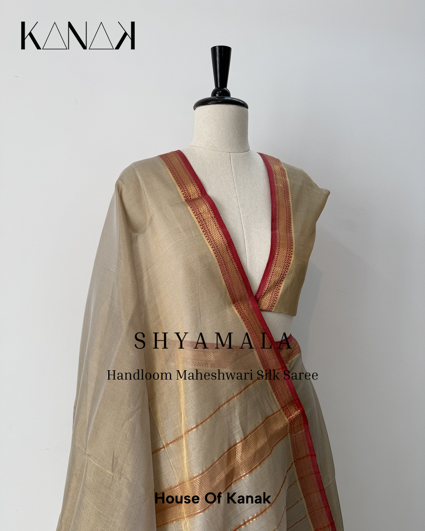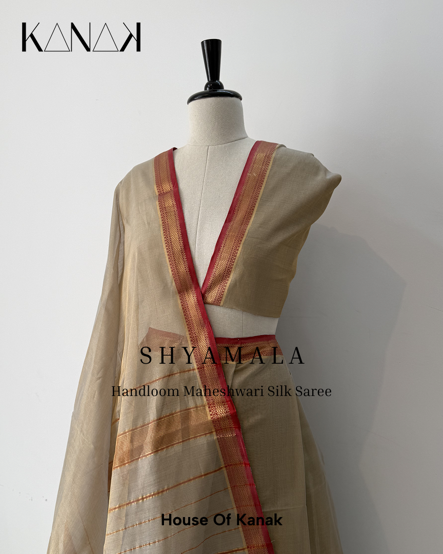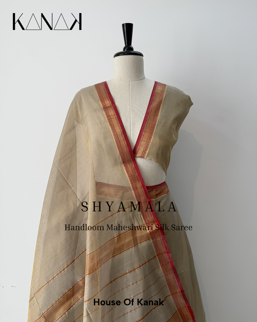 Handwoven in pure Maheshwari silk, this saree is light, breathable, and fluid, making it perfect for long celebrations, intimate gatherings, or elegant everyday dressing. It is designed for the woman who appreciates subtle sophistication — someone who knows that true style doesn’t chase trends, it creates presence.