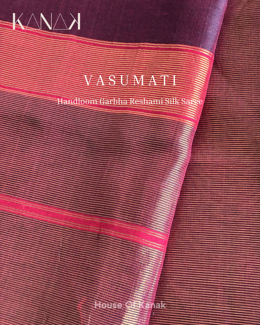A luminous Maheshwari Silk Tissue drape, woven in the rare harmony of antique rose and blush gold. Each fold unveils a new shade — soft pink when still, molten gold when it moves.