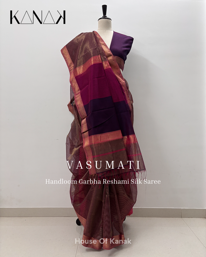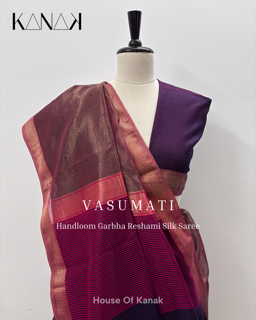 Handloom zari artistry turns this saree into a timeless heirloom, crafted to glow with grace and grandeur.